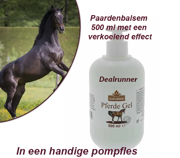 1x Stuk Paardenbalsem 500 ml met een verkoelend effect Lotion pompfles met verfrissende en verkoelende massagegel. Verzorgt de huid en is gunstig voor spieren, gewrichten, rug en benen. Over een groot gebied aanbrengen en goed inmasseren Ingrediënten Melissa Officinalis Leaf Extract, Achillea Millefolium Bloem / blad / stengel extract,, Propylene Glycol, Phenoxyethanol, Ethylhexylglycerin, Eucalyptus Globulus blad olie,, Viscum Album blad Extract, Foeniculum Vulgare zaad Extract, Humulus Lupulus (Hop) Cone Extract, Valeriana OfficinalisRoot Extract, Sodium Hydroxide, natriumacrylaat Copolymeer (s) minerale olie (s) PPG-1 Trideceth-6, limoneen, CI.19140.42090 Deal voorwaarden: • Na bestelling krijg je een bevestiging per mail van ons toegestuurd. • De producten worden geleverd op het afleveradres naar keuze. • De originele prijs is gebaseerd op de adviesprijs. • Kleuren kunnen enigszins afwijken van de afbeeldingen. • Als de maat/kleur niet in het optiemenu staat, is deze uitverkocht. • Telefonisch bestellen niet mogelijk. • Op alle deals zijn de algemene voorwaarden van toepassing. • Het product ontvang je binnen ca. 04 werkdagen (NL) / 06 werkdagen (BE en DE) niet meegerekend weekend, zon- en feestdagen • De verzend-, handelings- en administratiekosten bedragen: Vanaf €6,95 voor Nederland en €7,95 voor België en voor Duitsland